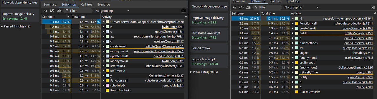 아래 스크린샷은 스켈레톤에서 데이터를 포함한 실제 엘리먼트로 전환되는 시점에 메인 스레드 Task를 확인해본 것으로, 왼쪽이 prefetch 그리고 오른쪽이 initialData 방식을 사용했을 때의 결과이다.